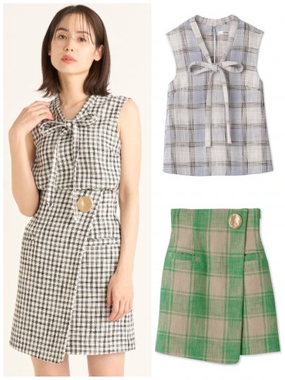 上下お揃いで着るのが可愛いブラウス+スカートのセットアップ。ツイードの上質さがストレートのハリのある肌質を引き立てます。