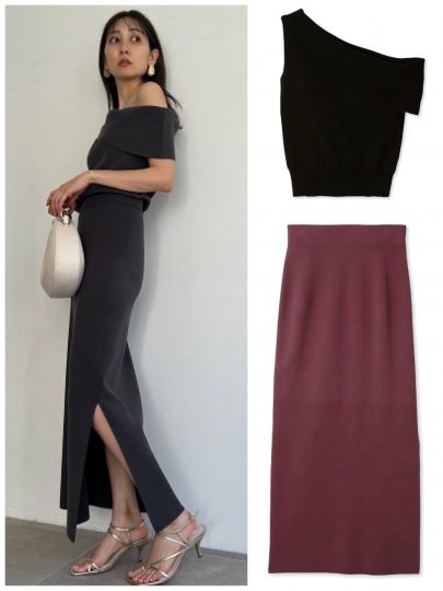 身頃はニット、スカートはシアーな布帛の異素材MIX。ジャストウエスト位置での切り替えがスタイルアップの鍵です。