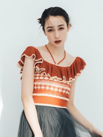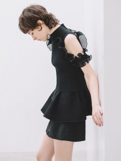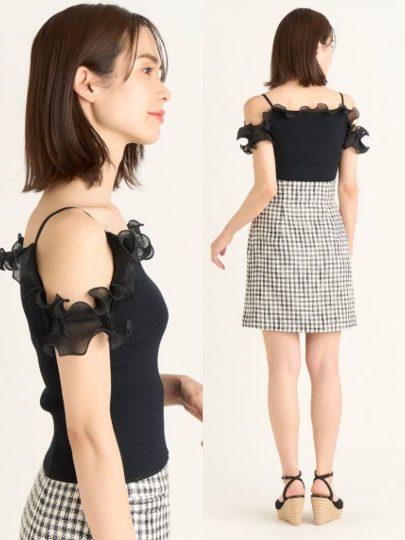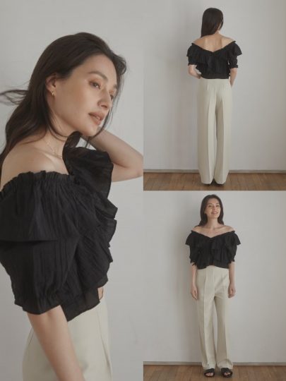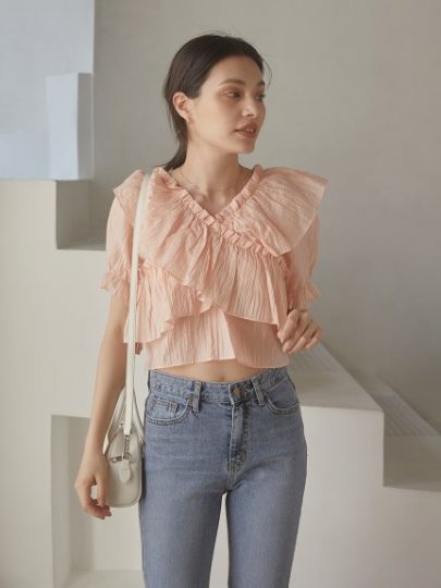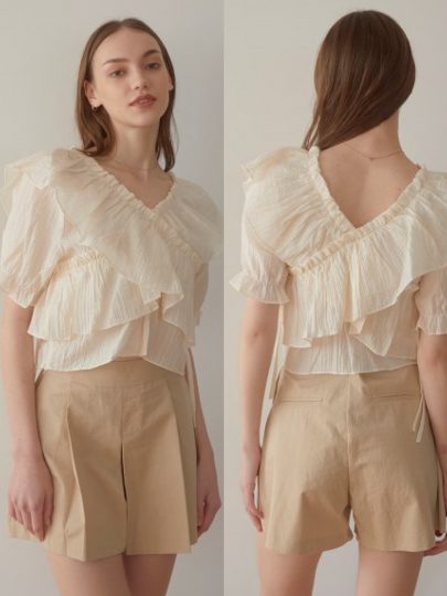 ほんのり透け感のあるシフォンブラウスに、大ぶりのショルダーフリルをトッピング。前後Vネックで抜け感を出し、ショート丈も相まって夏らしく軽やかにキマります。