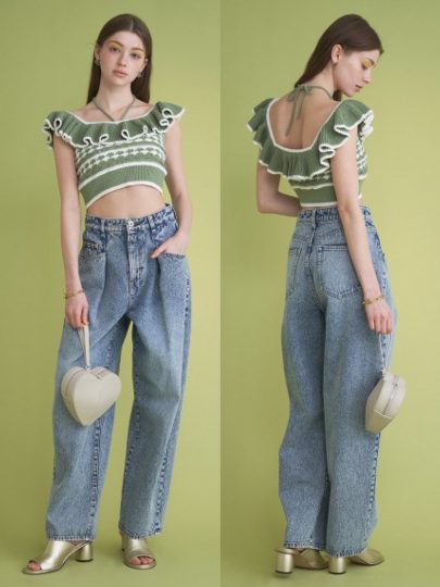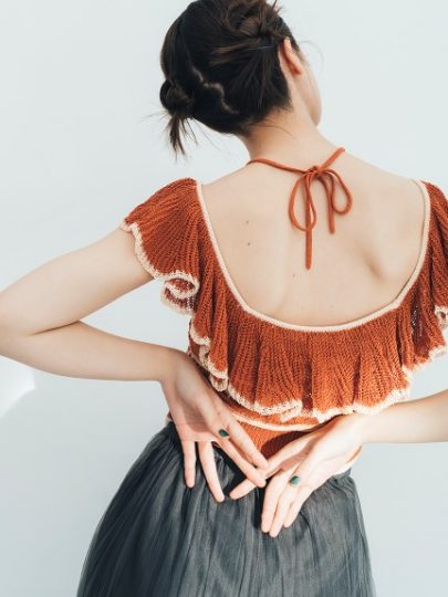 レトロな柄編みも、フリルネックも可愛い♡ コンパクトな着丈に、背中は大きく開いて夏らしさ全開! ゆるいデニムやワイドパンツ、マキシスカートなどでちょいバカンスっぽいコーデが好相性。