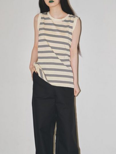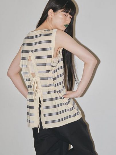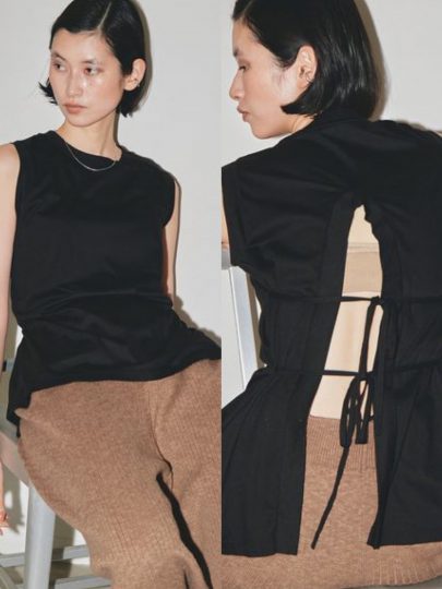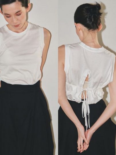 ベーシックなフロントデザインに対して、後ろ姿は華奢なリボンが効いたオープンバックで女っぽ! 古着のようなクタッとした風合いも魅力で、こなれ感のあるヘルシーな肌見せが叶います。