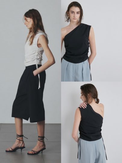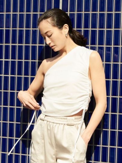 エレガントで大人見えするワンショルダーのトップスは、取り外せるブラパッド内蔵で、しかもUVカット機能付き! 同シリーズのロングスカートクロップドパンツとセットアップもおすすめです。