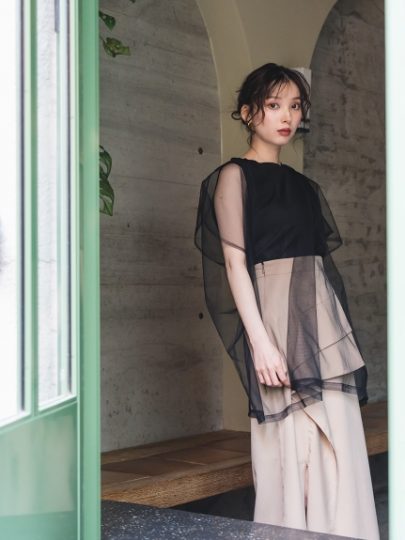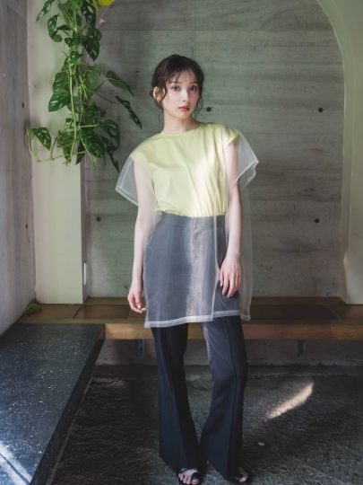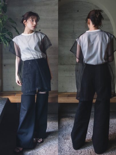 シンプルなフレンチスリーブTに、ビッグシルエットのチュールトップスをON。レイヤードの奥行き感で、着るだけでスタイルに自然なメリハリ。パンツにもスカートにも合わせやすく、夏はショーパンもあり。