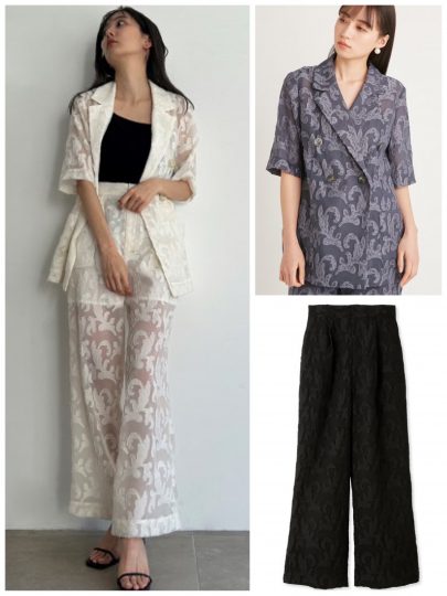ジャケット+パンツのマニッシュでゆるっとしたセットアップは、まさに骨格ナチュラルの鉄板。シアーなジャガードなら女らしい印象に。