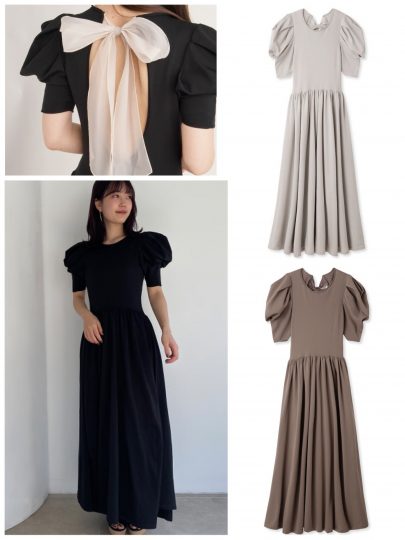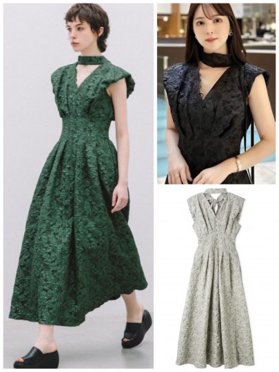 チョーカー風リボンやくるみボタン、ウエストのタックなど、ディテールにこだわったドレス。凹凸のある素材がナチュラル向け。