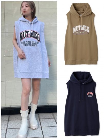 ルーズなサイジングにスウェット素材、パーカ型と、骨格タイプに好相性な要素が満載。重ね着も楽しめるノースリ&ミニ丈です。