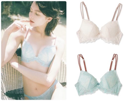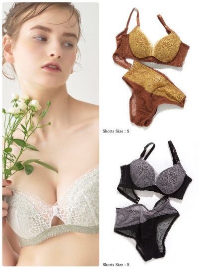 レースの下にはベージュカラーを敷き、レースの柄が立体的に、より美しく浮かび上がるデザイン。ブラは凸凹が少ないので、薄着の季節にも重宝。同シリーズのショーツと合わせればセットで着用可能。