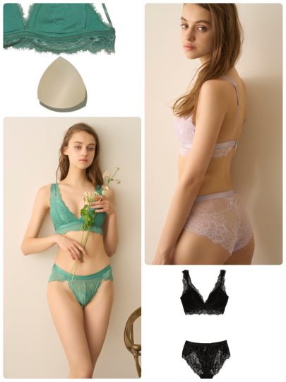 贅沢にレースをたっぷりと使ったブラとショーツのセットが30%OFFの¥3,773で登場。ノンワイヤーながら、しっかりと胸をホールドし、安定感のあるつけ心地。