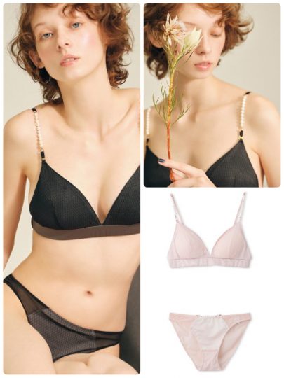 パールの肩ストラップがポイントのブラ&透け感のあるショーツのセット。