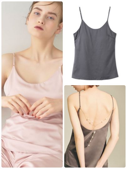 フロントはシンプル、バックはパール付きチェーンをあしらったキャミソール。背中の開いたお洋服に合わせると、後ろ姿がより華やぎます。カップ付きなので1枚でサラリと着られるのも魅力。