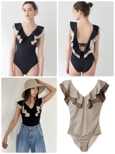 ボリュームのあるフリルが印象的で、顔まわりを華やかかつスッキリ見せてくれるスイムウェア。デニムなどのボトムと合わせれば洋服見えするので、タウンユースも可能♡