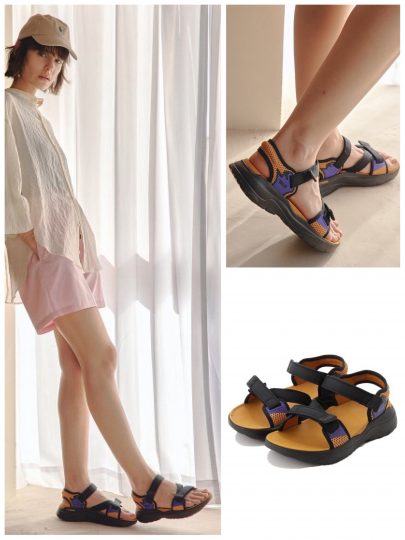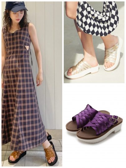 編み込みデザインが印象的なサンダルは、甲がしっかり覆われるので安定感バツグン。オリジナルの3色展開の他、金具をゴールドにしたのも別注モデルならでは。