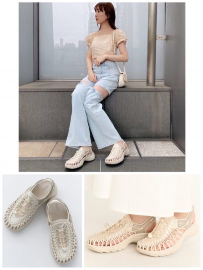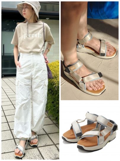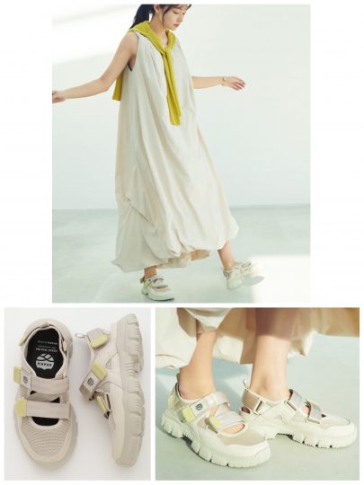 スニーカーの歩きやすさとサンダルの軽快感を両立したモデルは、シーンレスに使えます。合わせる服を選ばない、ニュートラルなベージュのワントーン。