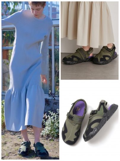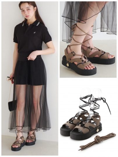 女っぽいレースアップとスポーティなディテールの掛け合わせが新鮮。2色付いてくる靴紐は気分に合わせてチェンジできます。分厚くても軽いEVA素材のソールが歩きやすい。