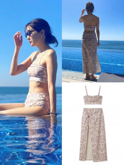 深いスリット入りのロングスカートを組み合わせた、フェミニンな水着セット。ビキニショーツは今っぽいハイウエストシルエット。オリジナルのペイズリー柄が華やかでテンションがアガります。
