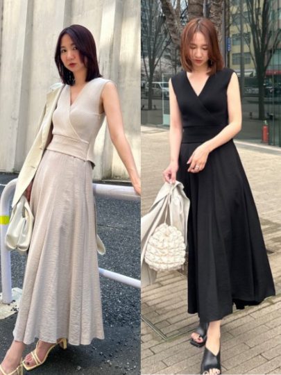 上身頃は清涼感のあるリブ編みニット、スカート部分は落ち感のあるツイル素材をドッキング。デコルテをキレイに見せてくれるカシュクール仕立てでほんのりセクシーにキメつつ、後ろの丈がやや長く、ボリューム感があるスカートがドラマチックな印象に。シワも気にならずメリハリのあるスタイルが作れて、ドライブデートにぴったりです。正直、カラバリで欲しい…♡