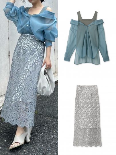 おしゃれ感度が高い女友達も納得の、寒色系ワントーンコーデをチョイス。トップスはニットとオーガンジーシャツレイヤード仕様で、ボタン着脱によりそれぞれ単品でも使えるデザイン。清涼感のあるミントがおすすめ。こちらはSUMMER SALE対象のため30%オフの¥16,170です!