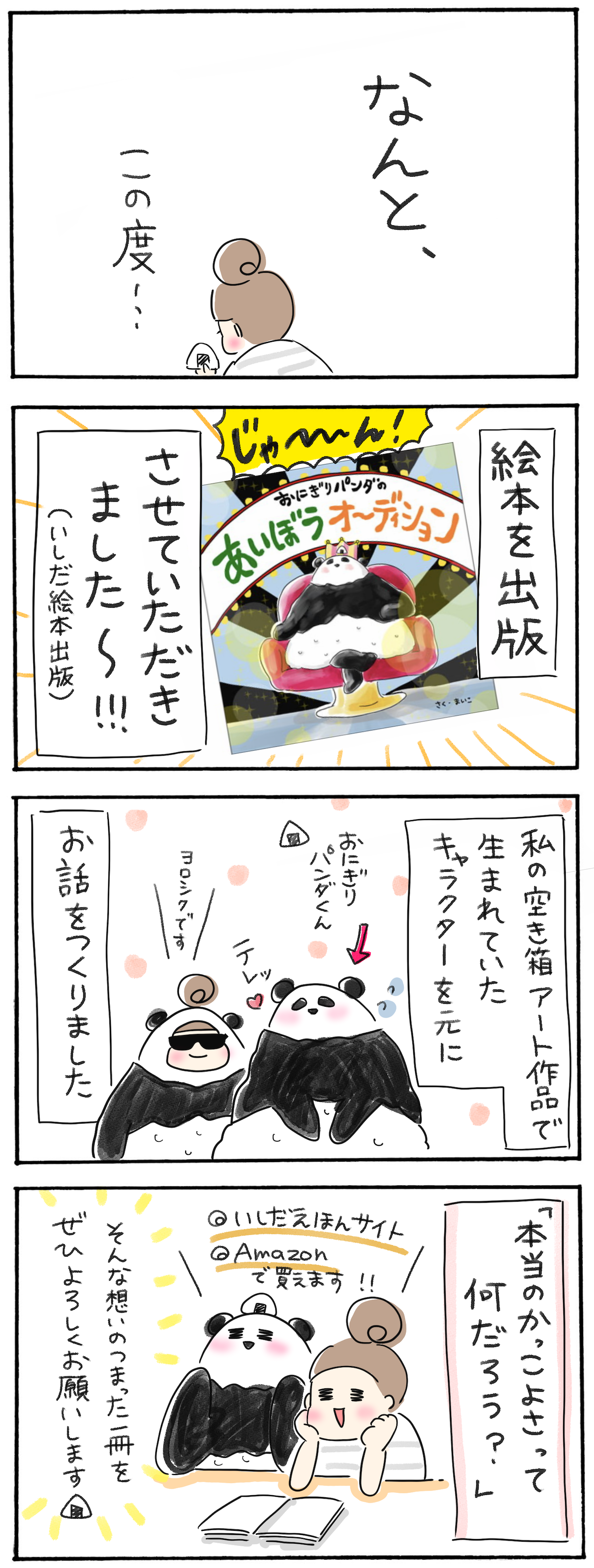 そうなのです。自身が行っている空き箱アートの活動で「おにぎりパンダ」というキャラが頭に浮かび作品を作っていたのですが、今回絵本のお話を受けてこのキャラでストーリー展開してみたい!と思ったのです^^