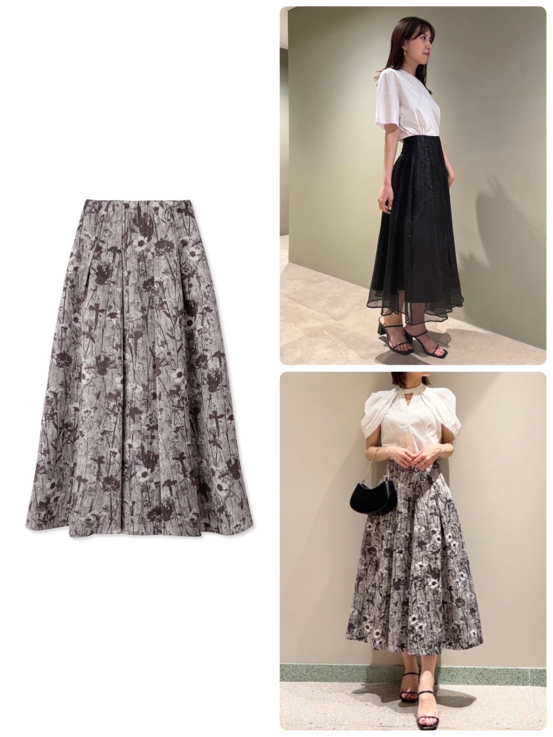 オーガンジーを重ねた黒、パーティーなどのオケージョンにもオススメの花柄(シルバー)など色によって様々なバリエーションで作られたボリュームスカート。長いシーズン使い回せるのもポイント。