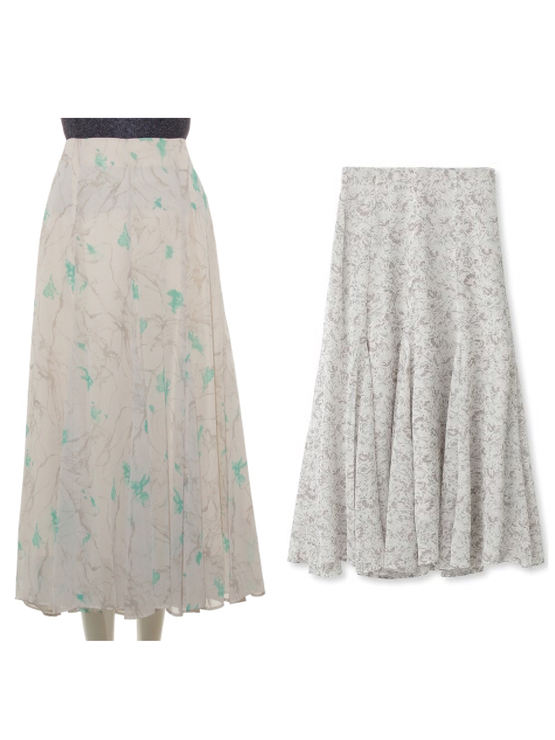 大理石のような柄や、ヴィンテージ調など、繊細でラグジュアリーな柄をシフォンに施した女性らしいスカート。上品な柄なので、お仕事にもOK。なんと半額で購入できます。