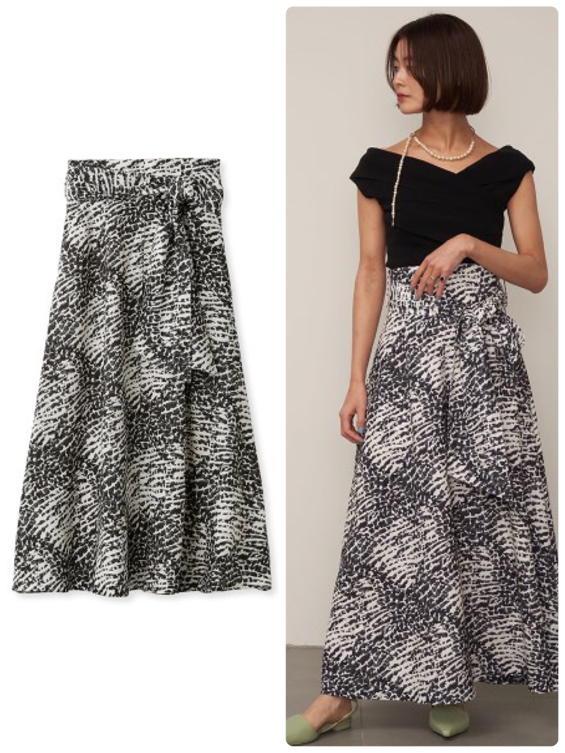 縦に入ったパイピングが細見え効果を倍増させてくれ流、すっきり柄スカート。軽やかでサスティナブルな素材で作られているので、着心地も抜群。スナイデルらしい上品な色合いなので、大人ぽく履けます。