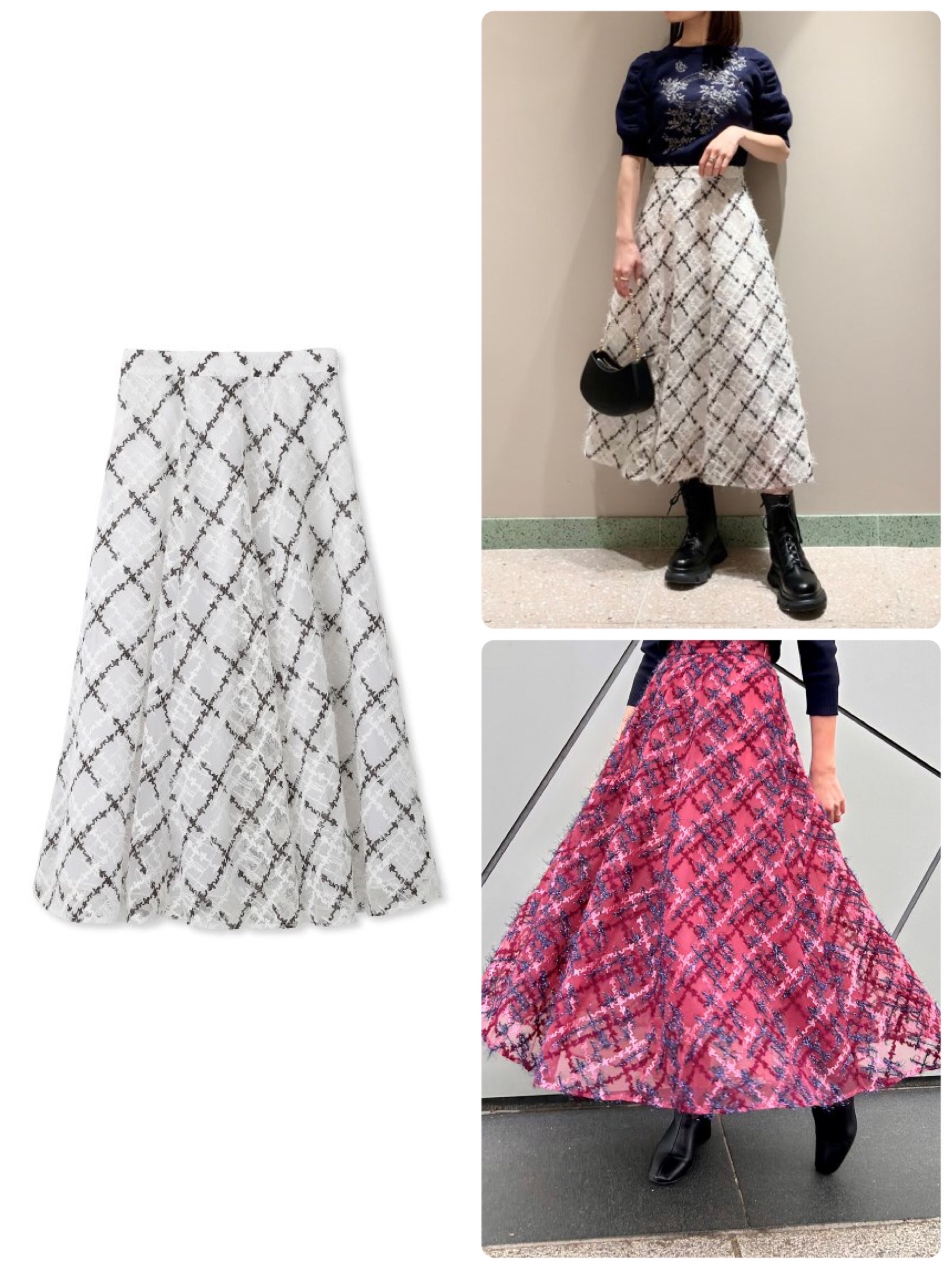 繊細なチュールにチェック柄の刺繍を施した、愛らしく華やかなスカート。繊細な作りなのでとても高見えします。たっぷりとしたフレアデザイン。