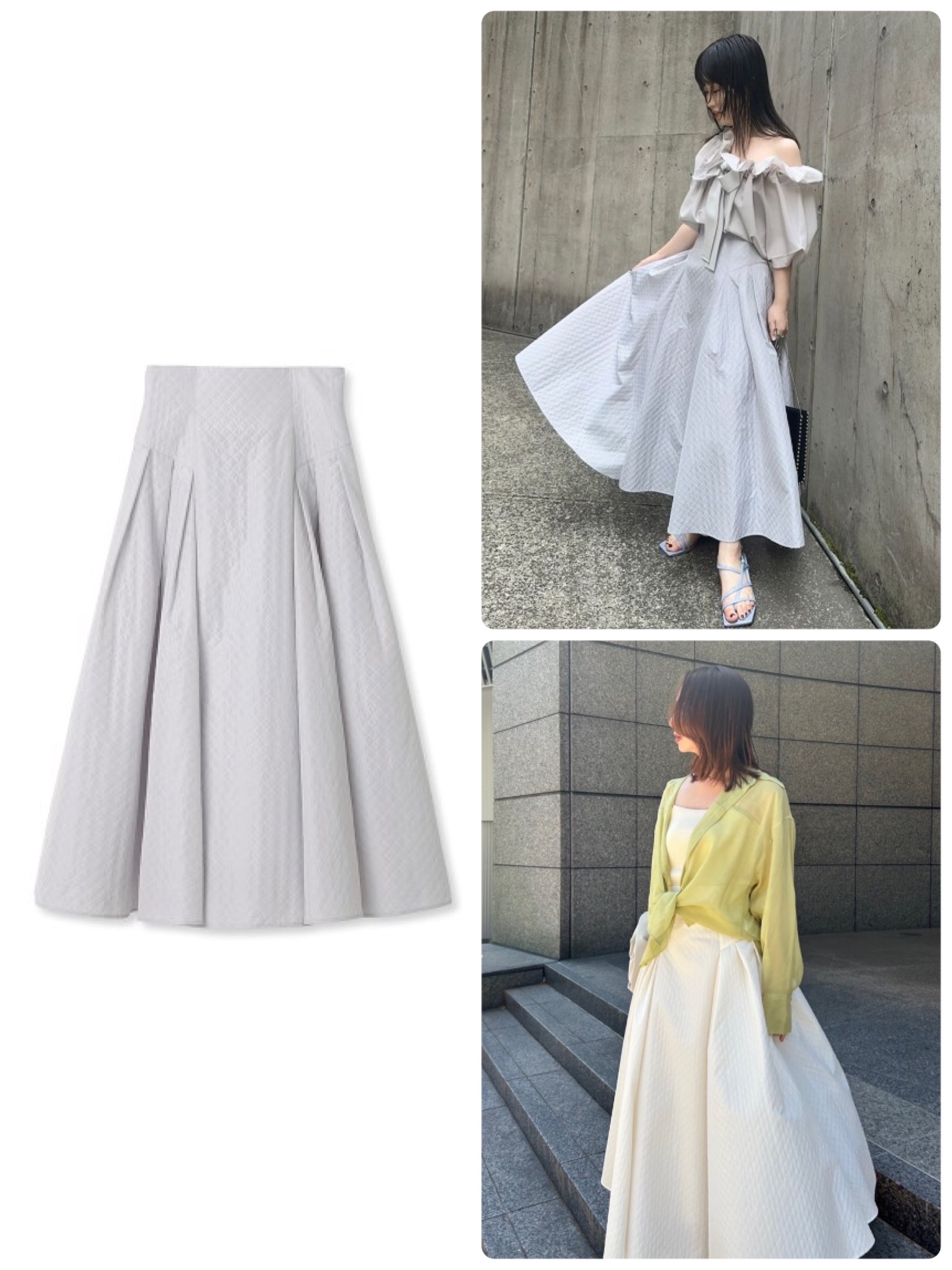 キルティングのダイヤ柄のように見える、ジャガードで作られた高見えスカート。写真にあるようにふわっと贅沢に広がるので、着映え感がすごい。会食などきちんとしたシーンにも自信を持って望めます。
