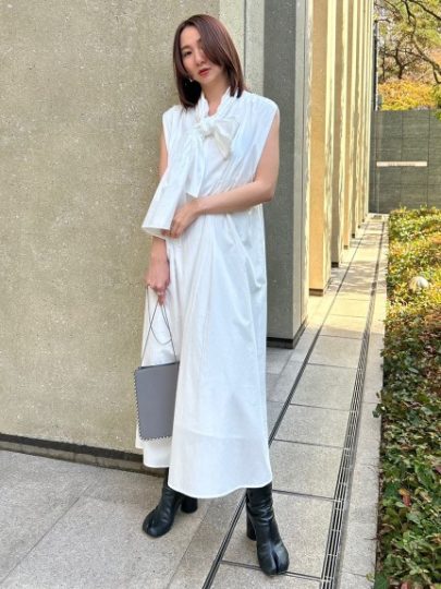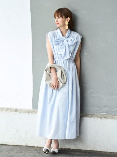 大きめのボウタイが華やかな印象を与えるドレスは、ほどよく体から離れるストレートシルエット。細い共布ベルトでウエストマークするも良し、ベルトなしでリラックスした着こなしも良し。また、襟元はロングボウタイとスタンドネック、どちらを前にしても着用可能な2Way仕様の技ありデザイン。暑い季節にさらりと着られるコットン素材もポイントです。