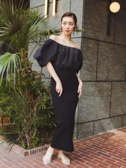 布帛ブラウスとニットスカートをワントーンでまとめたようなコンビワンピース。スカートはストレッチ性を備えたモダールコットン素材を使用。首元にはゴムを入れることで、オフショルダーとしても2wayで着用が可能に。