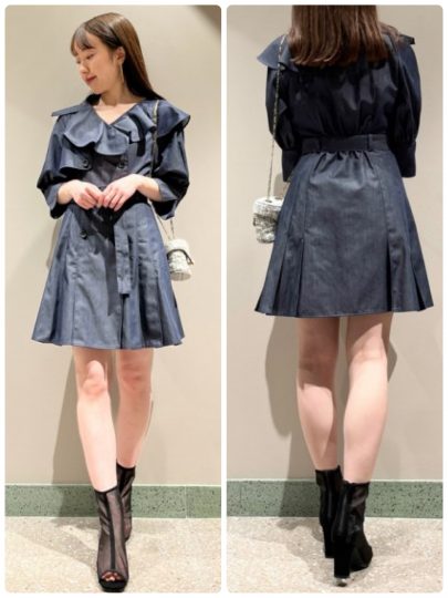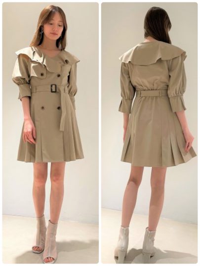 トレンチディテールを落とし込んだ、クラシカルなミニワンピース。襟元は大きめのフリル調にして、女性らしくエレガントに仕上げています。ウエストをベルトでマークしたメリハリのあるシルエットなので、スタイルアップ効果も期待。着まわしやすいベージュ、デニム素材を使用したインディゴ、どちらも素敵!
