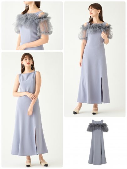 品の良いノースリーブワンピースとチュールボレロのセット。マーメイドシルエットのワンピは深めのスリットを入れることで足さばきも◎。シアーなボレロはたっぷりのフリルで華やか! 涼しげなペールトーンのブルーも今っぽく、真夏のオケージョンシーンに最適です。