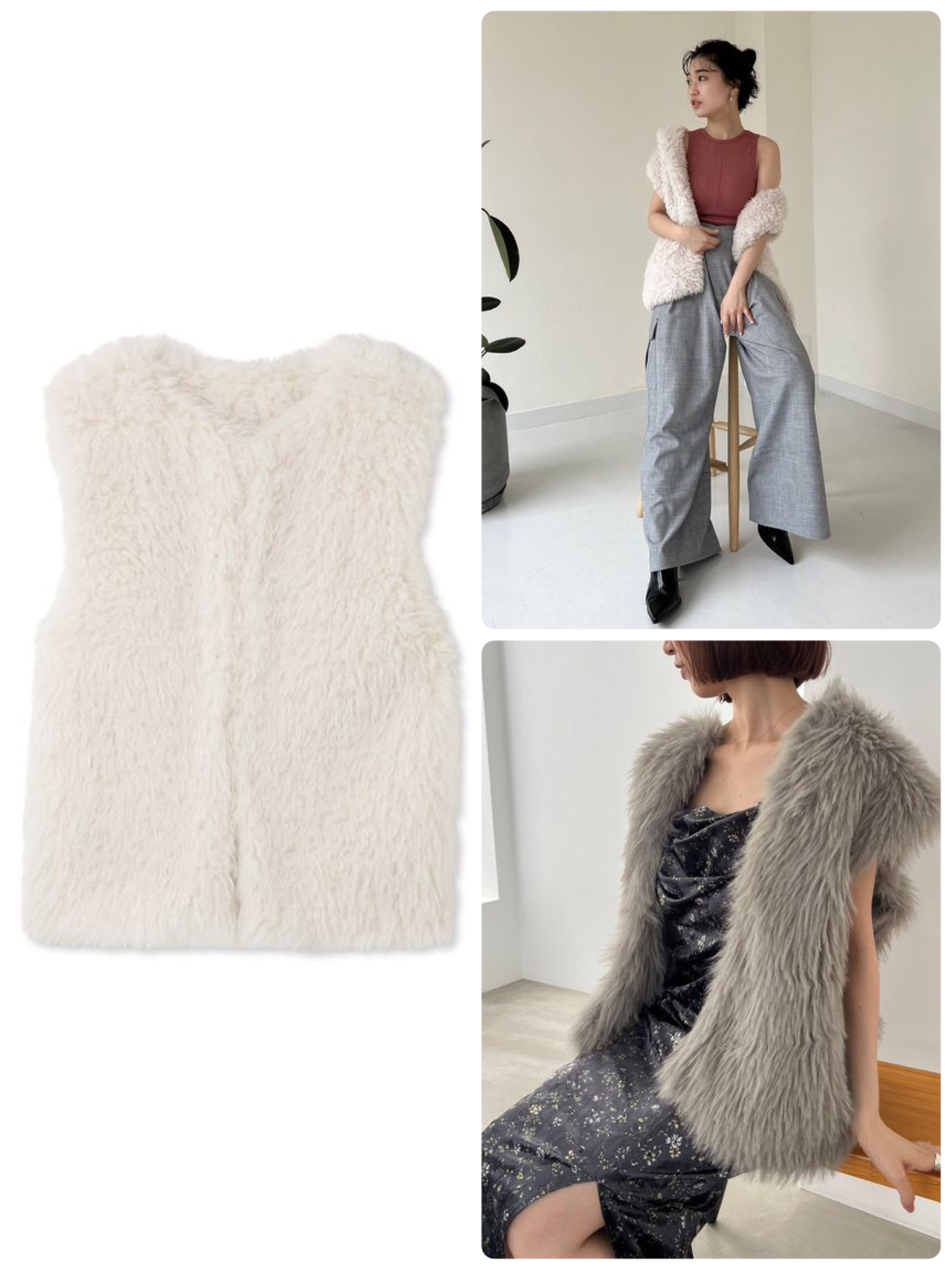 MIESROEからは、フロント部分を大胆に深Vにカットしたベストが登場。先シーズンもすぐ人気色が売れてしまったので、早めに予約を。大人っぽいコクーンシルエットなので、サイドから見たシルエットもモードで洒落てます。サステナコクーンファーベスト/ミースロエ