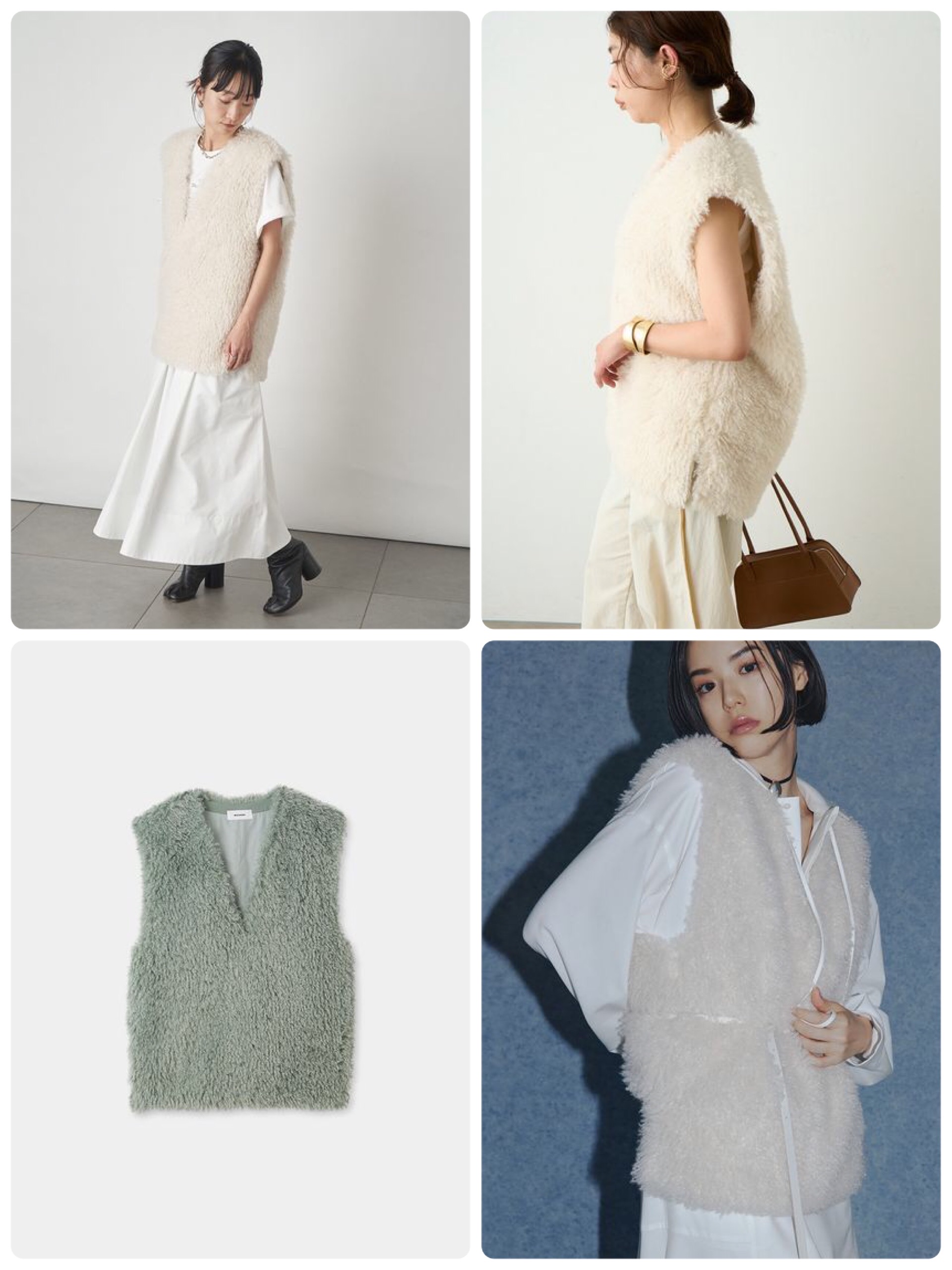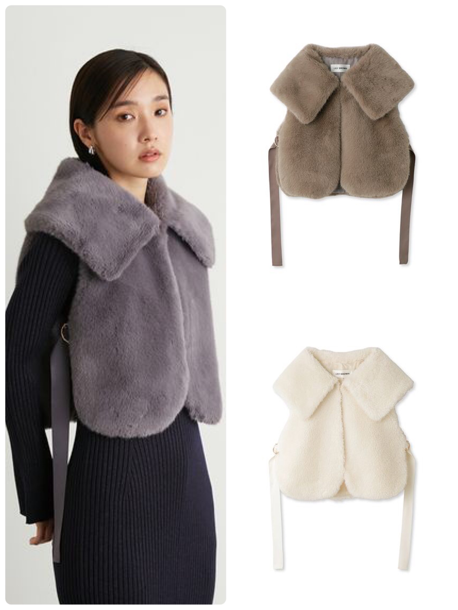 コンパクトなサイズ感の襟付きベストで登場したのがリリーブラウン。サイドが開いて、リボンでサイズ感を調整するデザインなので、すっきりと着こなせます。もこもこした風合いのボア素材も高見えします。サイドリボンファーベスト/リリーブラウン