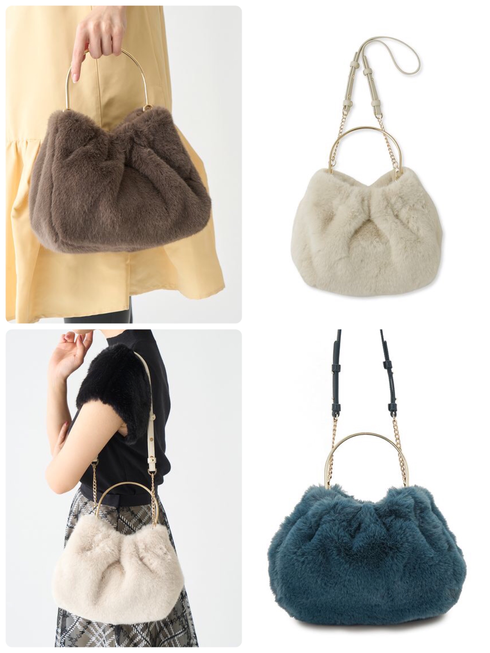 メタルハンドルとバッグの口元のギャザーが可愛らしいモダンなファーバッグ。夜遊びやカジュアルなパーティーなどにもオススメ。メタルハンドルファーバッグ/CELFORD