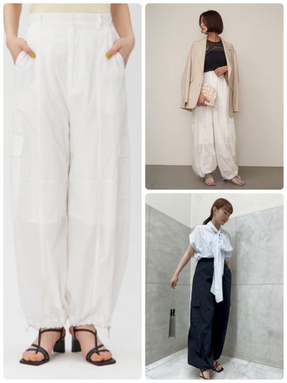 メンズライクなイメージの強いカーゴパンツですが、程よく透け感のあるリサイクルナイロンで仕上げたことで女性らしさも漂う一着に。こちらは裾のドローコードを絞ることで、コクーンのようなシルエットにアレンジすることができるんです。レディライクなアイテムとの組み合わせもおすすめ。