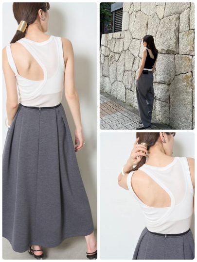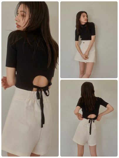 前から見るとスクエアネックのシンプルトップスですが、振り返った瞬間大胆なバックオープンデザインでギャップがたまりません♡