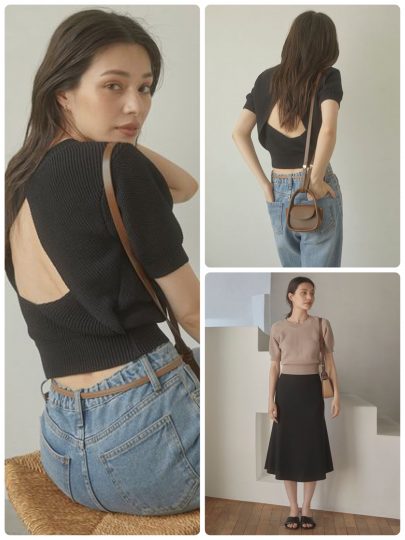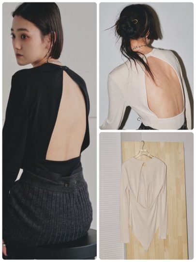 一見シンプルかつベーシックなニットトップスですが後ろ姿はかなり大胆♡このギャップが最大の売りです。下品にならず、ヘルシーな印象に導いてくれるデザインも◎。