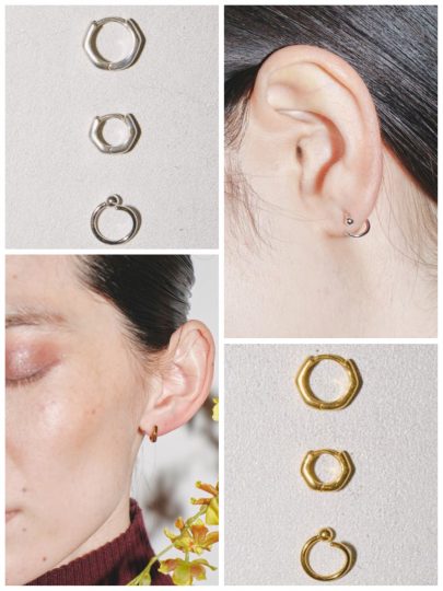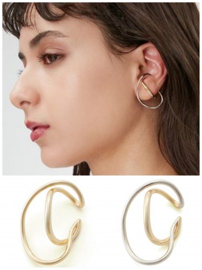 こちらは番外編の、装着すると2連フープ風に見えるイヤーカフ。大胆な曲線がモード感を高めます。