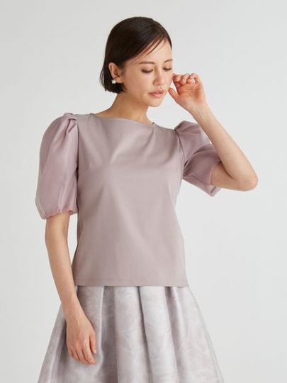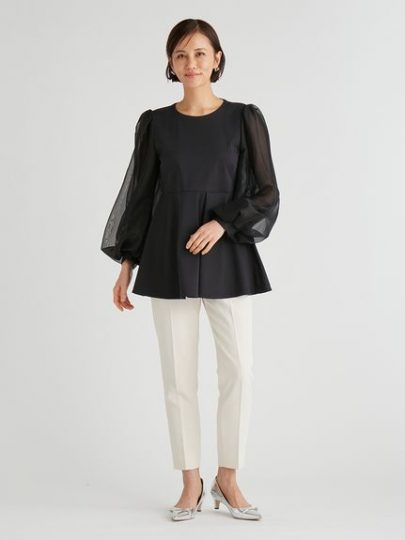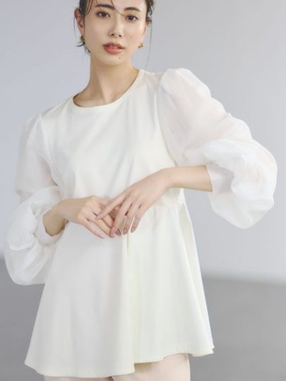 透け感とボリューム感のある袖がポイントのカットソー。袖はオーガンジーとチュールを重ね、タックやギャザーを入れて肩を強調しすぎないシルエットに。身頃は肌触りの良いカットソー素材。タックインしてももたつかず、アウトで着てもスタイルアップして見える仕様です。