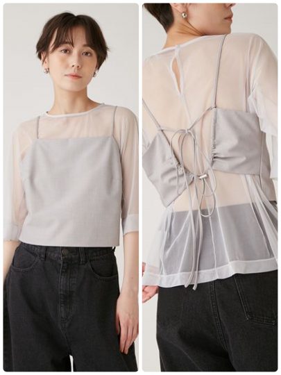 Tシャツシルエットのチュールトップスに、布帛のキャミを合わせたセットアイテム。感度の高いスタイリングを叶えつつ、別々でもスタイリングを楽しめる優秀アイテム。