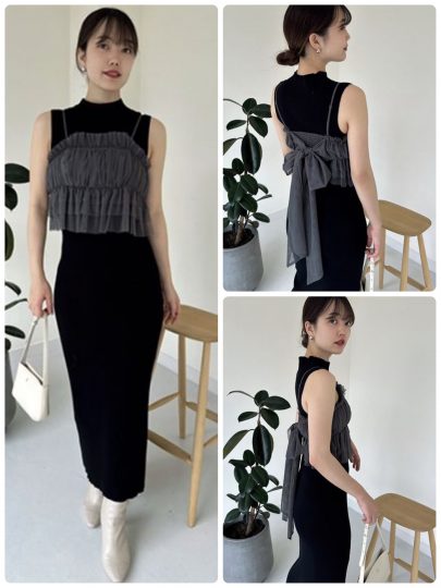 旬のレイヤードコーデが完成するチュールキャミ&ニットワンピのセットアイテム。キャミソールは背中側でリボンを結ぶデザイン。ニットワンピと合わせることで甘辛のバランスが良いスタイリングが完成します。それぞれ単体でも着用できるのでお得感あり!