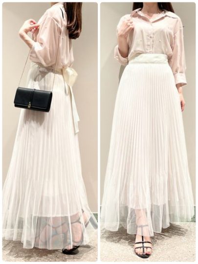 表側にはプリーツ加工を、内側にはギャザーを寄せた二枚仕立てのチュールを重ねたリュクスな一枚。付属のペチコートを外して、手持ちのパンツに重ねると、シアー感を活かしたレイヤードスタイルも楽しめます。