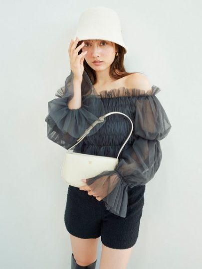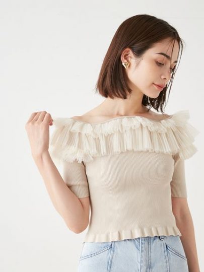ボリュームたっぷりのチュールフリルをあしらったニットトップス。チュールフリルが顔周りを華やかに彩りつつ、オフショルもスムーズ。デニムに合わせたMIXスタイルは、秋を待たずにトライしたい!。