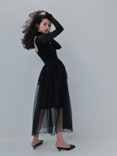 注目ブランドのSORINで見つけたのは、贅沢に5枚のチュールを重ねたスカート。ウエスト付近のチュールをフリルのように重ねることでボリューム感を演出。手持ちのレギンスやパンツとレイヤードして、今から活躍させたい。