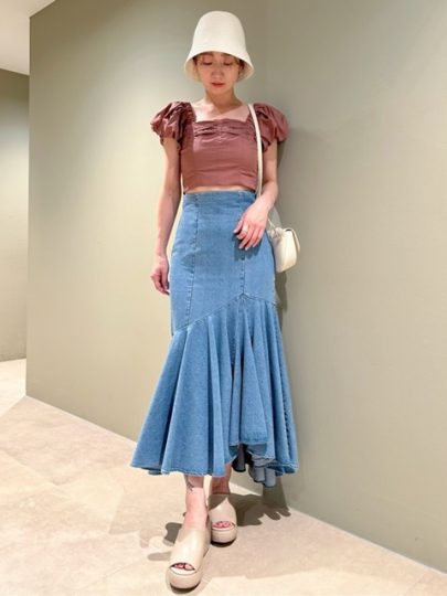 クロップド丈トップスでお腹をチラ見せして涼しげに。歩くたびに裾がヒラッと揺れるマーメイドシルエットのスカートは女度を高めてくれます。