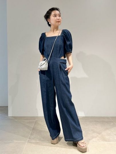 デニムのオールインワンで大人のカジュアルスタイリングが完成。デニムがカジュアルな分、高めのヒールやミニバッグ、パールアクセを合わせて女性らしさをプラス。
