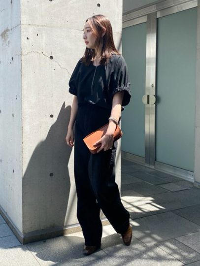 カジュアルになりすぎないようにブラックのワントーンで統一。異素材の組み合わせならブラックコーデでも重くならず軽やかな印象になります。