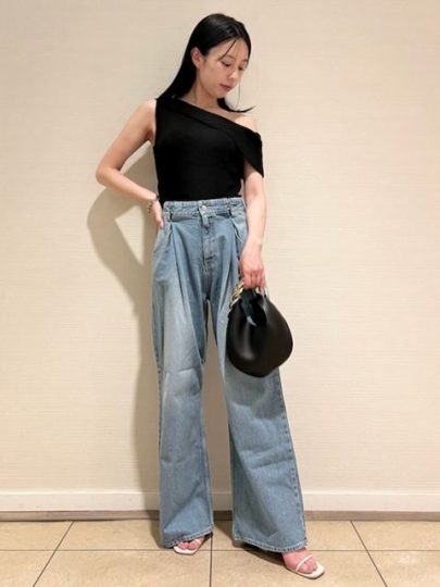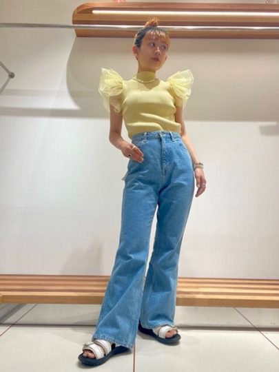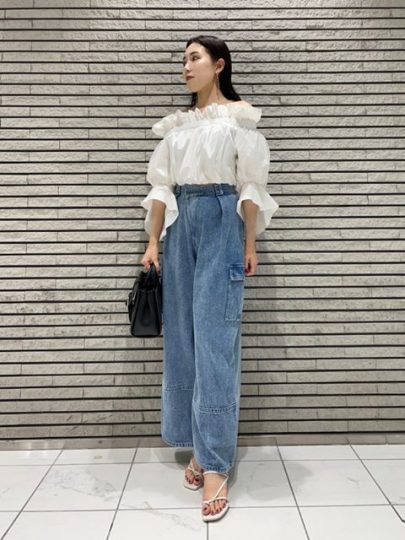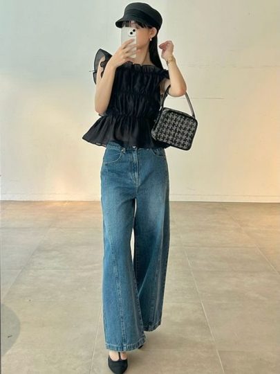 デイリーなデニムにフリルショルダーのトップスを合わせて華やかに。セミフレアシルエットのデニムパンツは脚長効果にも期待大です。