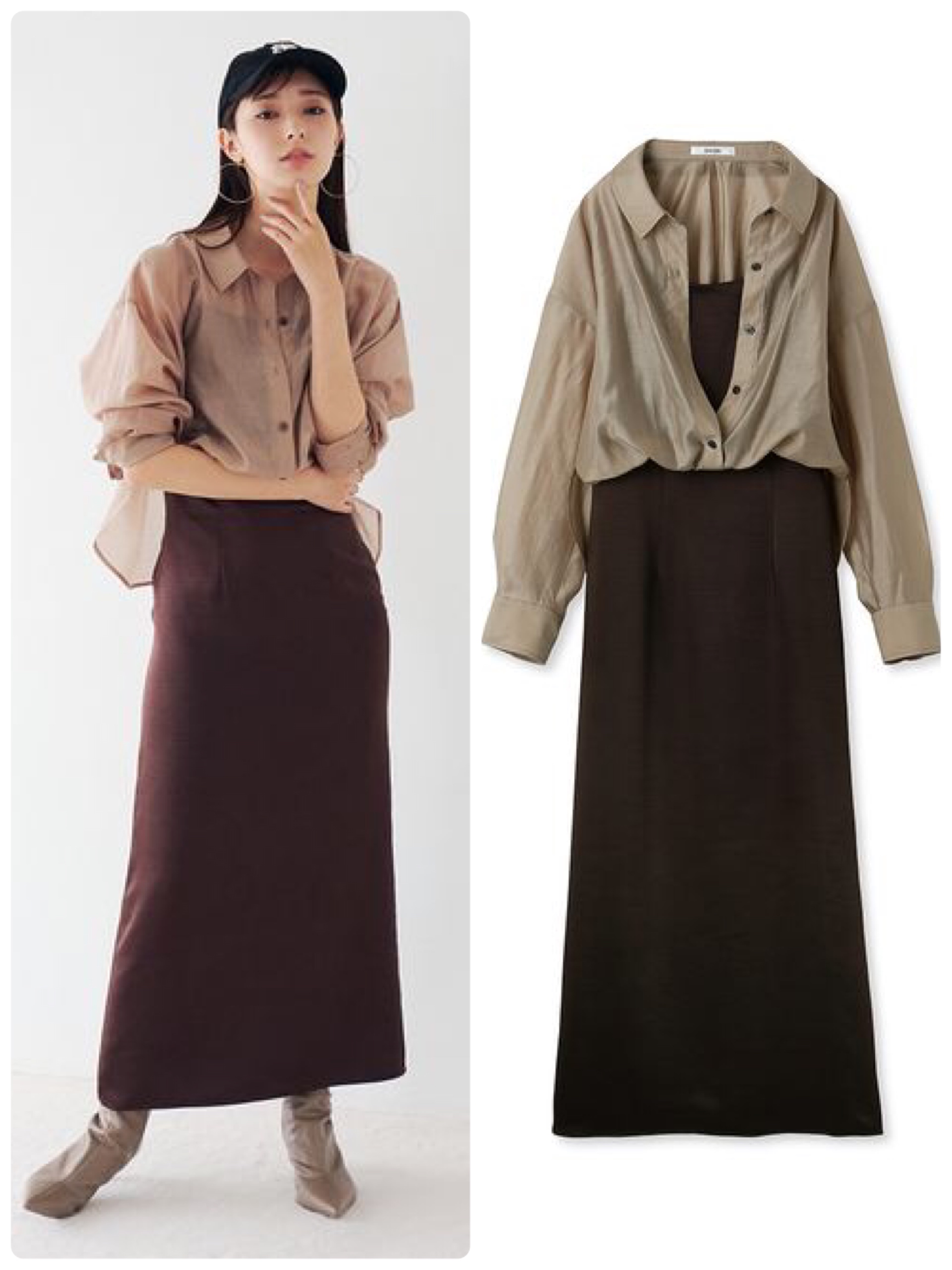 シアーなシャツとタイトなドレスがドッキングされた、大人っぽいドレス。透け感のあるシャツも、茉由ちゃんのように、カジュアルなキャップ合わせにすると、セクシーになりすぎずカジュアルなムードに。勉強になります。シャツドッキングサテンワンピース/スナイデル