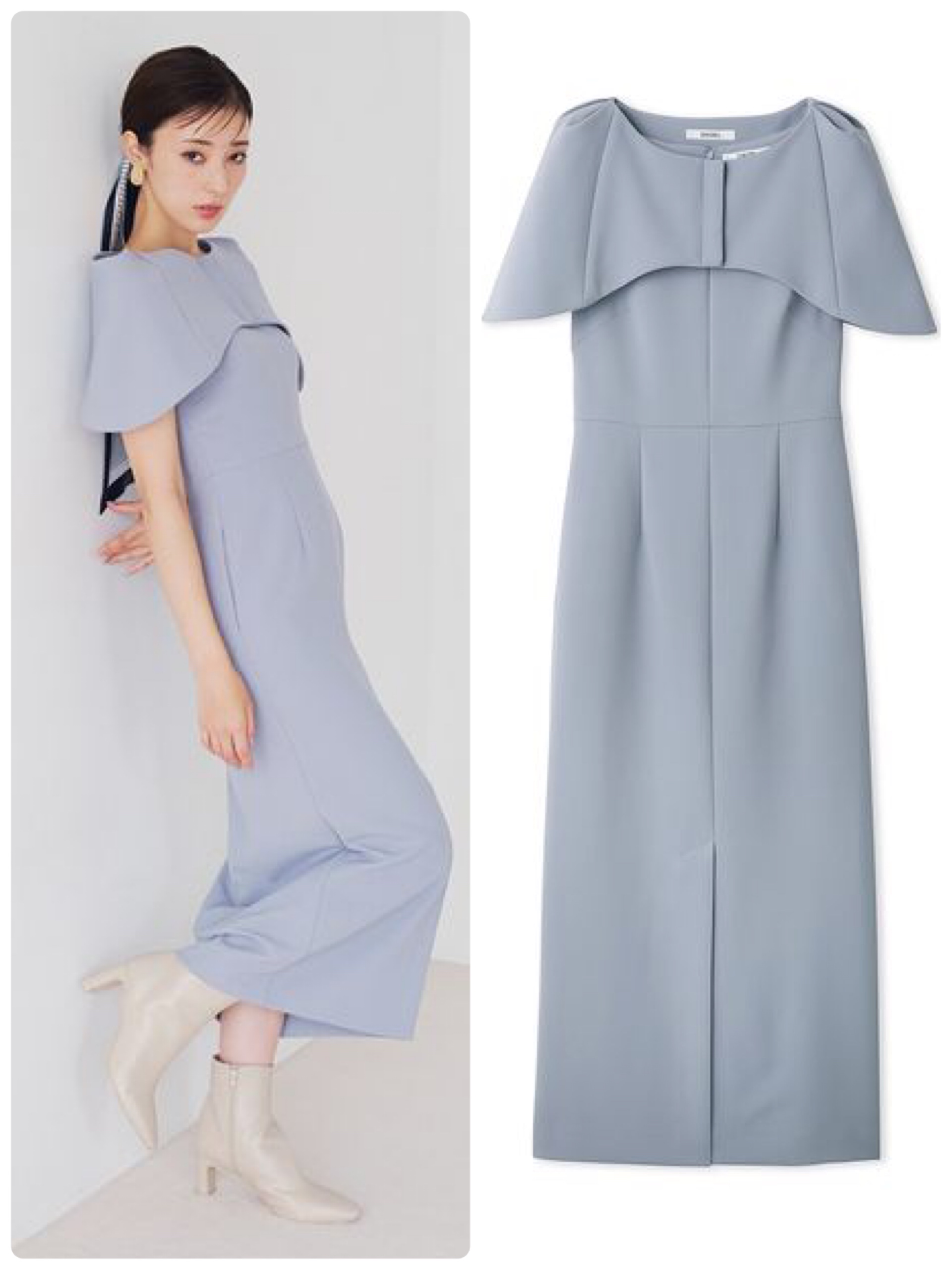 立体見えするケープと、すらりとセクシーなタイトドレスがセットになった大人のワンピース。クリーンなライトブルーがお似合いです。綺麗めな素材なので、パーティーなどにもおすすめ。ケープセットタイトドレス/スナイデル